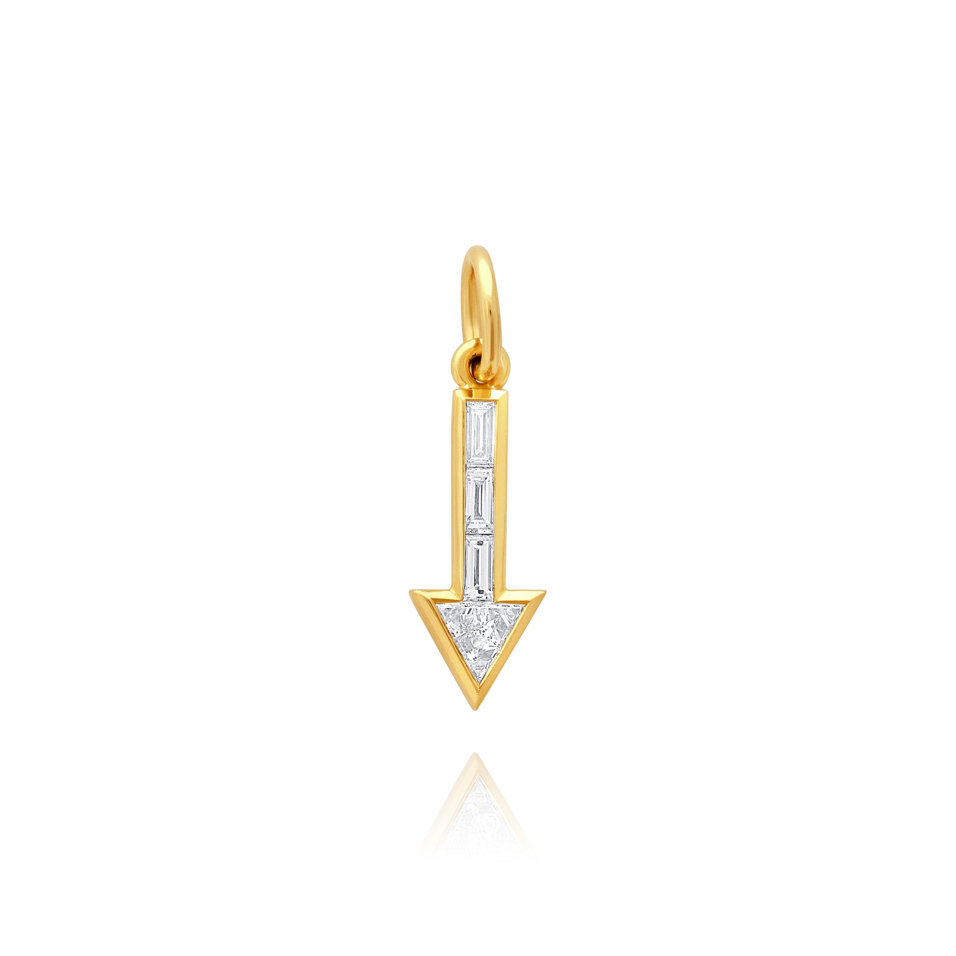 Handcrafted arrow pendant in 14K solid yellow gold, measuring approximately 1.1 inches in height (including bail). Channel-set with three baguette and one triangle-cut lab-grown diamonds, VS1 clarity and F color, approximately 0.89 carats total weight. Hand engraving available upon request. Features a hand-formed wire bail with a 4mm inner diameter (larger bail sizes available upon request).